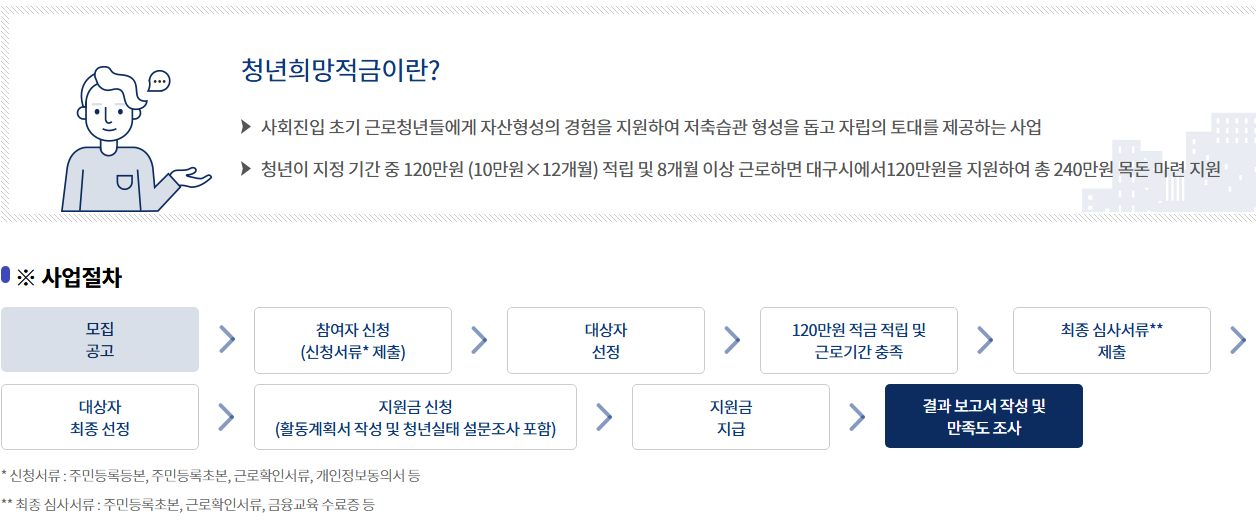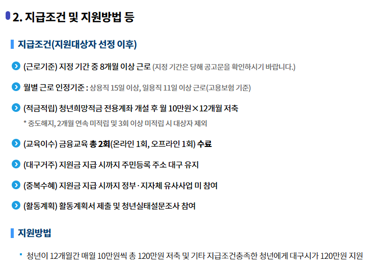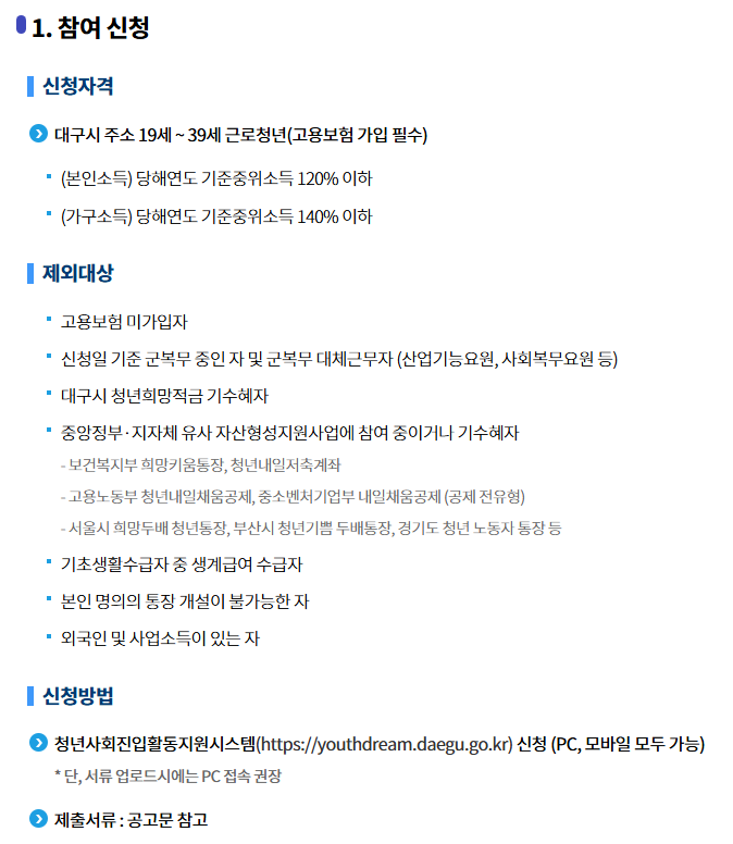 - 제외대상 :고용보험 미가입자, 신청일 기준 군복무 중인 자, 대구시 청년희망적금 기수혜